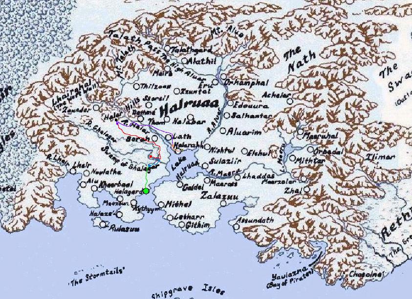 Session 1: (Monday 26 January 2004) During Session one All characters started of in Halagard, the former capital of Halruaa. Belloq Tarashi (a LN Human Fighter, played by Paulus) arrived on a ship, and went to an inn, where he was told to get his sword peace tied. He went to the nearest guard post, where he had his sword peace tied (with a curse for if the tie was broken) by the guard's wizard. Upon returning to the inn (The Sorcerer's Apprentice), Belloq was met by a Jordain. He was requested to come to the mayor's house at 1500 hours. Bareris Hahpet (A LEHuman Necromancer, Played by Dennis) was at the local Red Wizards enclave. The same Jordain went here to request an adventuring wizard to come to the mayor's house at 1500 hours. Bareris was the lucky one, on the concession that there would be profit to be made on this mission. Belloq arrived first at the house, followed shortly by Bareris. They were led into the house by Mateo (the same Jordain who met them earlier). They were led up two flights of stairs where they were led into an audience hall. Here they met Tethost after a short wait. After the introductions were made, Tethost told the two adventurers about a mission he had for them. They were to retrieve 4 items from a tomb of one of his ancestors. They were to take along another person, whom Tethost wanted to no longer have in his house. They would all be rewarded nicely. The two adventurers agreed, and Olostin (A LN Jordain-bornMonk, played by Remco) was shown in. Once again introductions were in order. Descriptions were given as to what they were to retrieve from the tomb, and they were told that they should bring the item's to Tethost's house in Halarahh once they had retrieved them. They were further told that they could make use of Tethost's library before going on their quest. Tethost left the room on other business, whilst the 3 adventurers were shown down one flight of stairs by Mateo, to go the the library. In the library Olostin Searched for some further info on his heritage, whilst Bareris searched for further info on the Tomb in the Akhkaur Swamp. Bareris Found a map here, on which the location was generally gevin, but not precisely. Olostin found some info on the Jordain-colleges and a map. After everyone was done in the library they rang a bell and Mateo apeared again. Mateo took them to the ground floor, where they were led into a side chamber. Here they were given complete discriptions of the item's and they were given some of the reward in advance. After this they set out on their journey towards the tomb. Whilst still traveling through town, towards the citygate, they came
